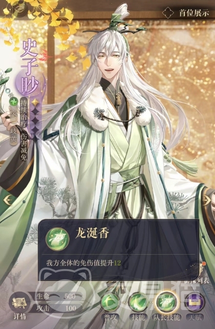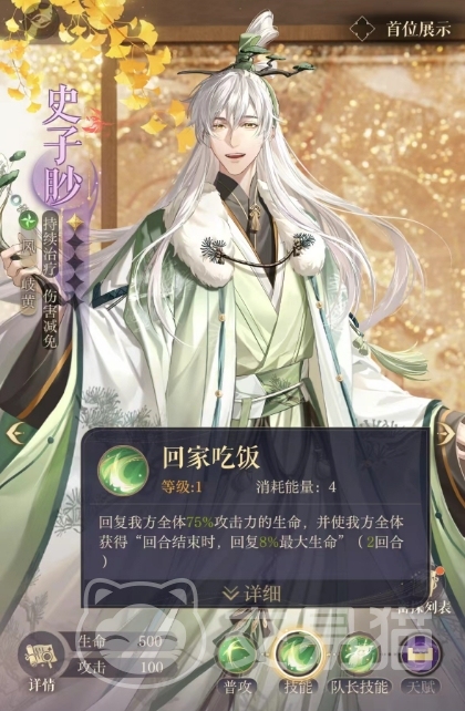 除了回家吃饭技能外,史子眇还有一个队长技能叫做龙涎香,这个技能可以将我方全体的免伤值提升12,作为队长的史子眇来担任是一个不错的选择,至少团队的生存会更有保障一些,龙涎香技能的存在使得史子眇不仅能够通过回家吃饭技能为我方队伍提供持续的生命恢复支持,还能够通过提升免伤值来增加整个队伍的生存能力,除了这些技能之外,天赋效果也是大家不能忽视的。