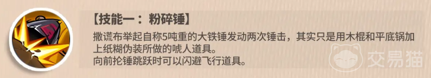 撒谎布的一技能粉碎锤可以让撒谎布举起一个有着五吨重的大铁锤,向敌人发动两次强力的锤击,这个大铁锤其实并没有五吨重,只是用木棍和平底锅加在一起用纸糊起来的一个道具而已,用来将敌人唬住,这也是撒谎布名字的由来,不过如果将这个大铁锤向前抡锤进行跳跃的话还可以闪避飞行道具哦。
