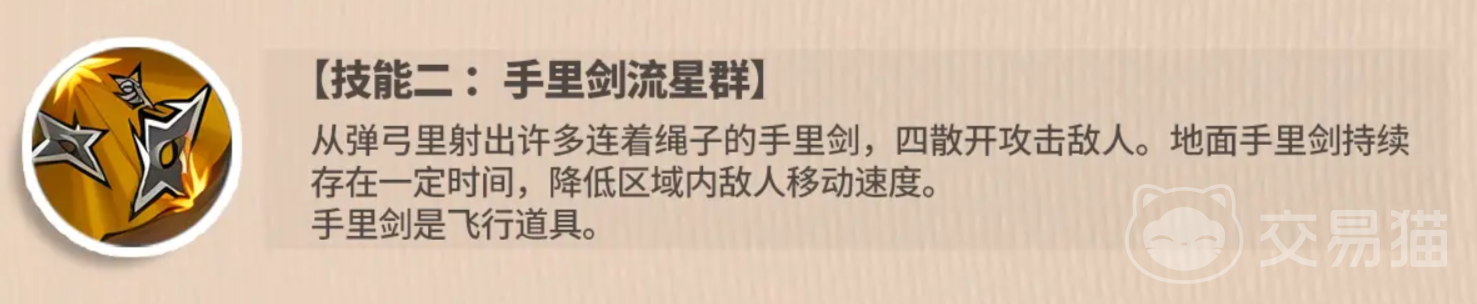 撒谎布的二技能手里剑流星群可以从弹弓里面发射出很多手里剑,这些手里剑会四散开来攻击敌人,地面手里剑还可以降低区域内敌人移动的速度并存在一定的时间。