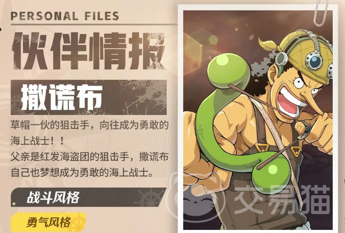 航海王壮志雄心游戏中的撒谎布将弹弓作为他的主要武器,他属于勇气的风格,本期小编要为大家带来的是”航海王壮志雄心弹弓撒谎布怎么样航海王壮志雄心弹弓撒谎布技能解析“,他是草帽一伙的狙击手,他的弹弓可以说是百发百中,如果你也对撒谎布的弹弓非常感兴趣的话,不妨来下方的内容中了解一下。