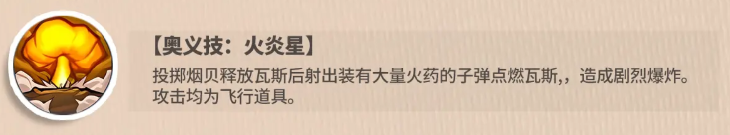 撒谎布的奥义技能火炎星可以向敌人投掷一个可以可以释放大量瓦斯的烟贝,然后撒谎布会射出很多装有火药的子弹来将这个瓦斯点燃,造成剧烈的爆炸,对敌人也造成终结伤害。