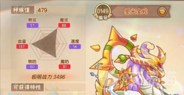 圣光宝蛇也是一个比较好的精灵,它是魔攻界的强者,拥有魔攻种族值比较高,它还具备强化和硬控的效果。不过很多玩家想要获得圣光宝蛇的时候,需要通过永恒梦境的特定关卡,然后到特定的楼层才能够将其捕捉。