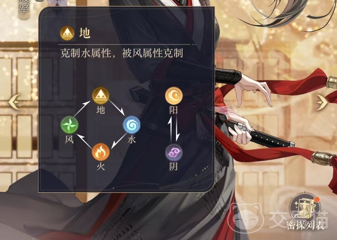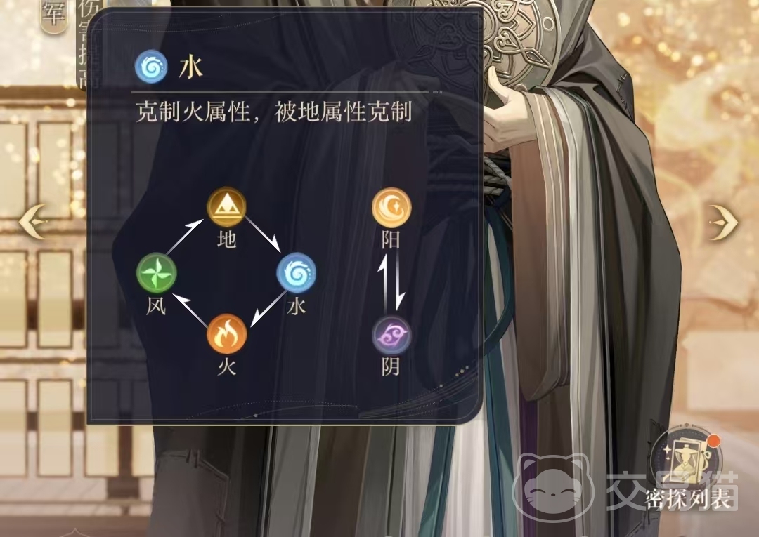 整体来说地克水,水克火,火克风,风克地阴阳互压制。就是如鸢密探属性克制关系。玩家们在游戏中搞清楚这个属性克制的关系在战斗的时候就会事半功倍!本期的内容就到这里和小伙伴们分享结束了,我们下一期内容再见!