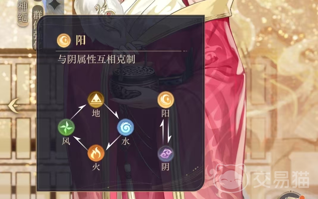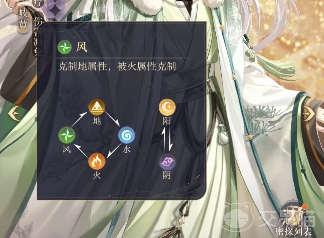 风属性的密探在游戏中克制地属性的角色被火属性克制代表角色史子眇。阴阳两个属性的角色相互克制住游戏中并不是很常见的属性,这六种属性在游戏中都会做玩家的密探上出现,在进行关卡战斗的时候敌人的属性和技能效果都会提前展示,玩家可以根据这个情报站游戏战斗之初,进行整体出战队伍的搭配。