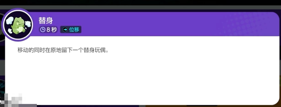 替身属于属于增强容错以及迷惑对手视野的技能,移动后短期内获得隐蔽且留下替身玩偶,一般用来抗伤或者逃命迷惑对方。升级后获得影子分身和烟幕。前者机制类似但提升伤害,同时产生多个分身,分身也会保持一定程度的面板属性且提供攻击伤害,但老练的玩家会分辨出不同分身与本体的差异,因此很容易找到本体,一般来说该技能的战局作用有限,且中期分身面板较脆,很容易被击杀。烟幕则是提供一段位移后留下烟幕,限制敌人视野且造成致盲,自身会获得短时间的隐身效果。该技能在野区小规模团战中效果非常出色,往往能够限制敌方C位输出,帮助队友快速入场或者安全脱离战局。