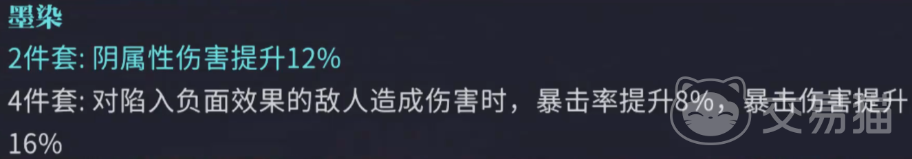 其次在装备选择上最好是选择有墨染词条的,因为两件套就可以将阴属性伤害提升百分之十二,四件套还可以提升暴击率,这两个都是长命锁最好的装备词条。