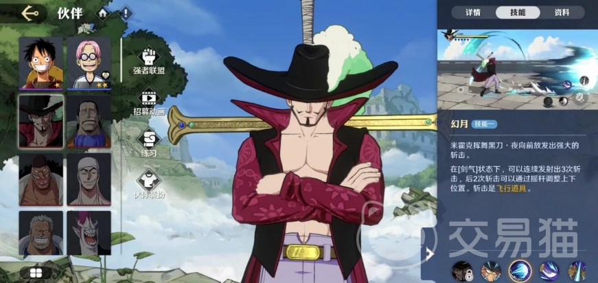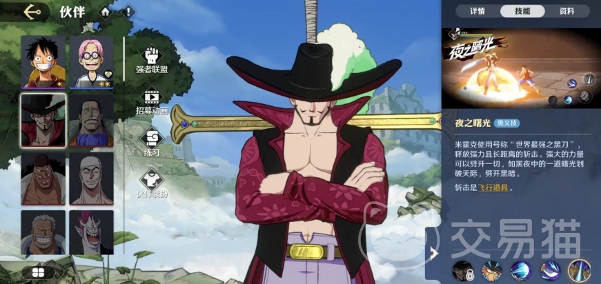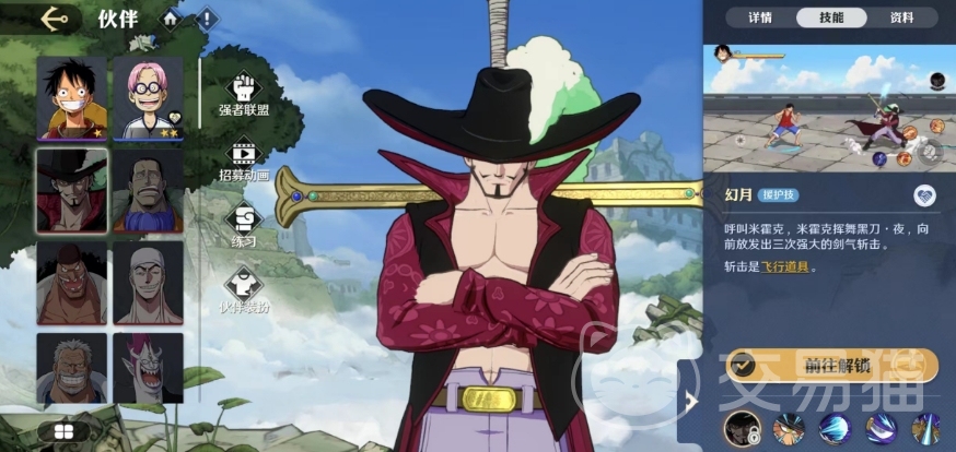 航海王壮志雄心鹰眼怎么样就为大家介绍到这里啦,鹰眼在游戏中的被动技能和主动技能都展现了他作为世界最强剑豪的实力,在游戏中大家将有机会亲身体验到这位传奇人物的实力哦,如果喜欢他的话,后期在游戏中获取不要忘记使用他的技能技巧哦。