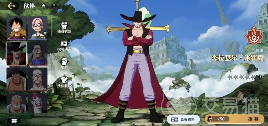 今天要介绍的是航海王壮志雄心游戏中的一位传奇人物,杰拉基尔·米霍克他以鹰眼为别号,被誉为世界最强剑豪,航海王壮志雄心鹰眼怎么样这个问题其实也是很多玩家好奇的,在游戏中大家是可以招募且使用这个角色来战斗的,而他作为王下七武海之一的角色,强度上面也曾令无数海盗闻风丧胆。