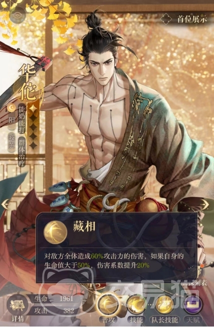这个普攻其实当自身的生命值大于50%时,伤害系数还会提升20%,所以输出不算高,毕竟他主要的强度也不是输出,除了战斗技能外,华佗还拥有强大的治疗能力,他能够为队友提供群体治疗,主要技能开颅手术不仅能够恢复我方全体成员的生命,还能对敌方全体造成一定的伤害,一举两得,当华佗施展开颅手术时,他会恢复我方全体成员的生命,恢复量高达自身攻击力的60%。