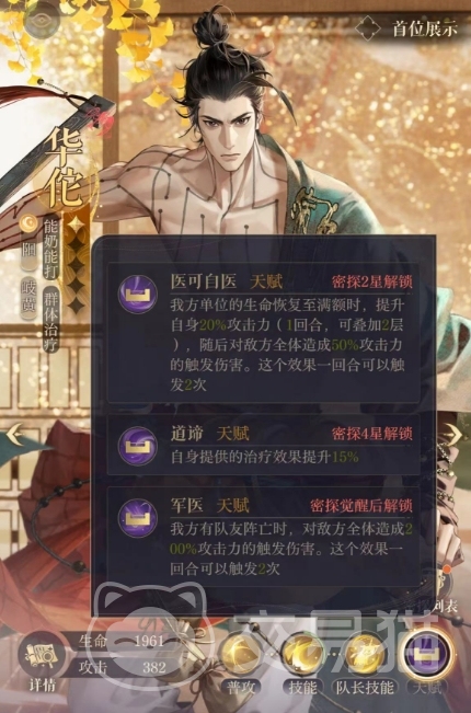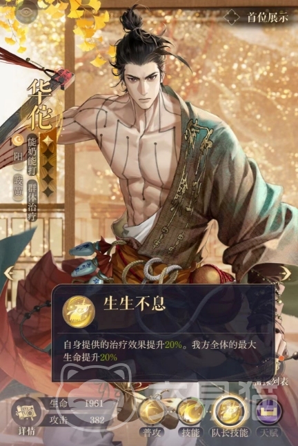 除了主要技能外,华佗还拥有一项强大的队长技能是生生不息,这一技能能够提升自身20%的治疗效果,同时让我方全体的最大生命值提升20%,这意味着在华佗的带领下,我方队伍将拥有更强的生存能力和更高的容错率,他的天赋效果同样是可以根据他的优势来进行战力提升的,当华佗达到密探2星时,他将解锁医可自医的天赋。