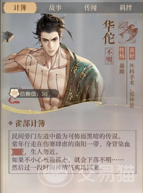 华佗在游戏中的人设相当独特,他性格暴躁但是喜欢进行外科手术,这种性格特点让华佗在民间旁门左道中流传着一些怪异的传说,据说他常年行走在伤寒肆虐的南阳一带,身背染血生人勿近,如果不小心被他抓走,就会下落不明,然而实际上华佗是为了治病救人,他的这些行为都是出于对医学的热爱和执着,在战斗中,华佗的普攻技能藏相能够对敌方全体造成60%攻击力的伤害。