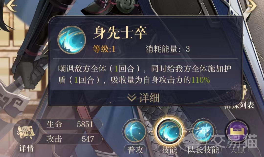 接下来是颜良密探的大招技能身先士卒,这个技能可以让颜良为全体编队成员附加自身攻击力110%的护盾保护,不仅可以分担敌方阵容的群体攻击伤害,还可以通过嘲讽限制敌方阵容技能的释放,有效增加编队全体密探的承伤值。