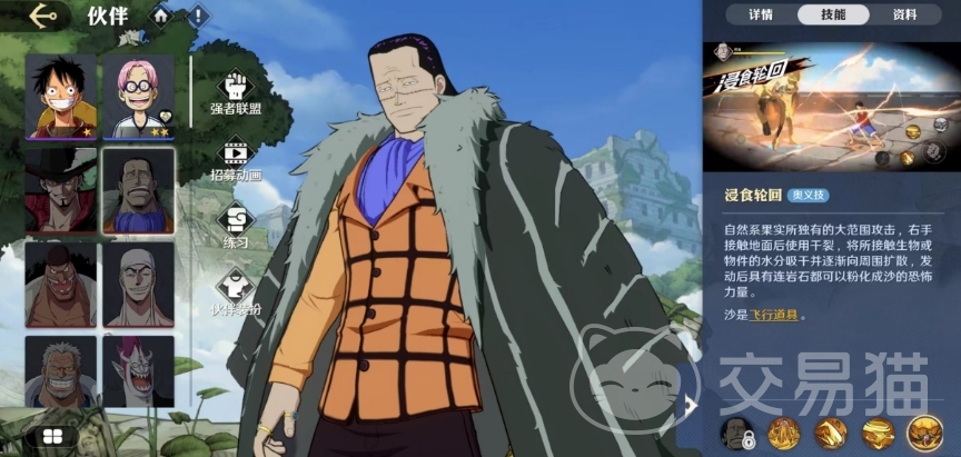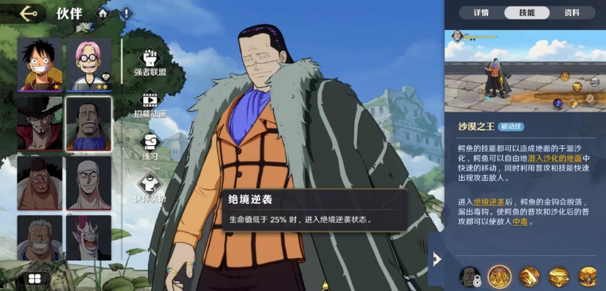 在航海王的动漫世界中,沙鳄鱼绝对是一个令人难以忘怀的角色,现在他也无比还原的出现在航海王壮志雄心当中,大家好奇航海王壮志雄心沙鳄鱼怎么样吗?在游戏当中他的形象独特,手中那巨大的铁钩更是成为了他的标志,但是同时他也不缺实力和哦,下面就是小编收集了这个角色技能效果啦。