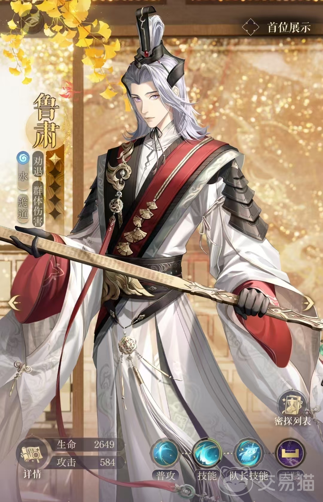 史子眇作为一个t0级别的紫卡奶妈,回复的血量是非常惊人的。铁打的奶妈适配度非常高,和颜良一起搭配牢牢的保护好c位的输出。鲁肃玩家在游戏中第一个抽到的金卡,输出能力一般但是有特殊的【劝退】效果,在触发的时候好能够劝退一个满血的敌人。