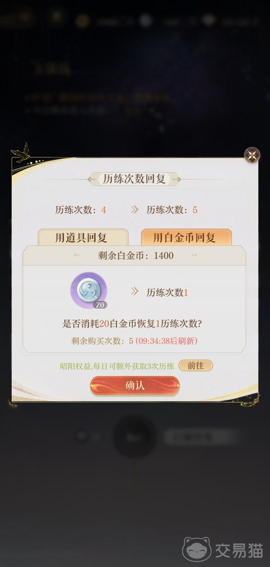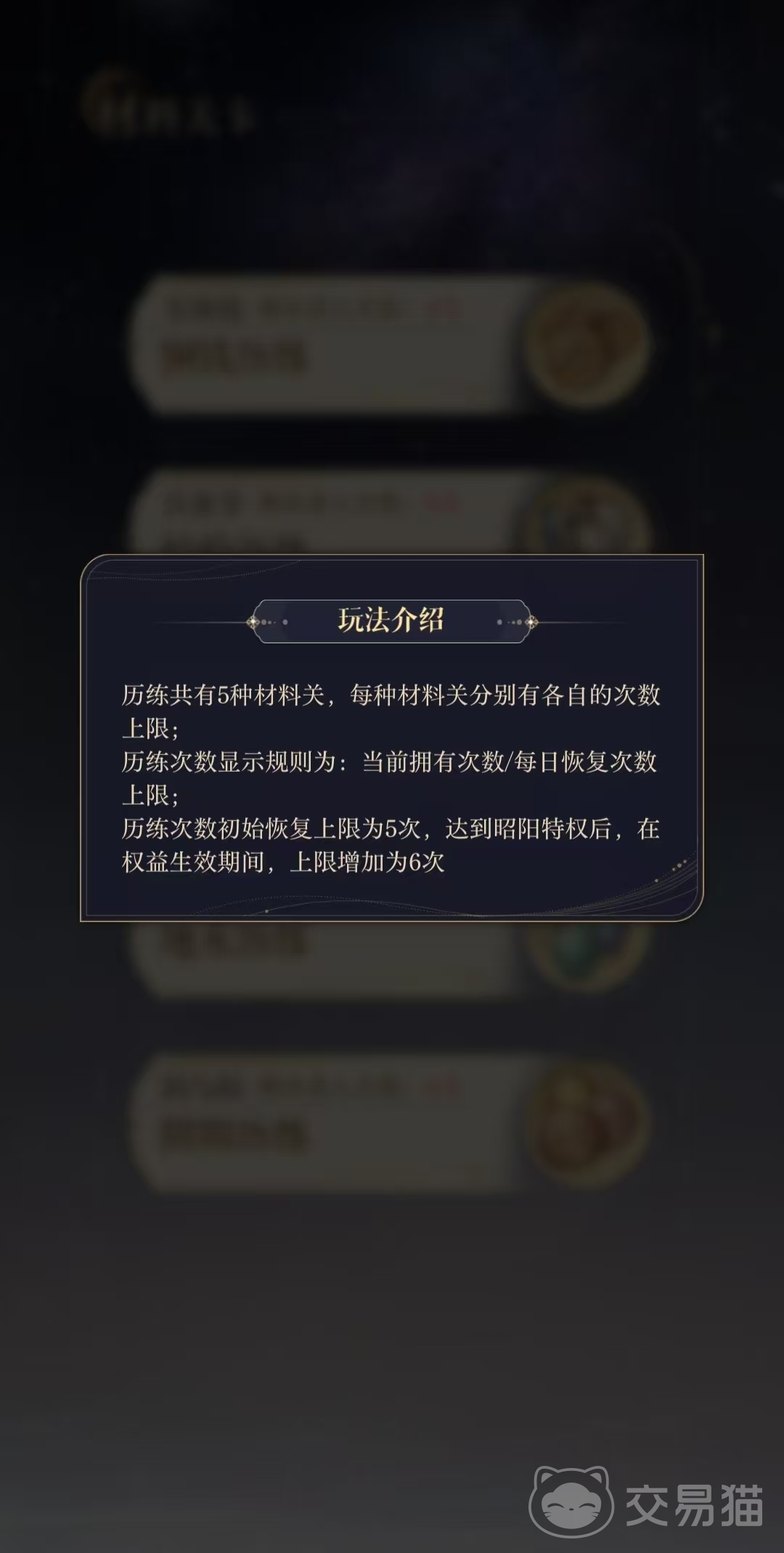历练玩法中每日每种模块的历练次数为5次,历练次数可用道具回复每日最多可额外获得一次。不过在玩家解锁朝阳的权益之后,所有材料关卡每日会额外获取三次历练。铜钱历练关卡主要是让玩家获得3万的铜钱。