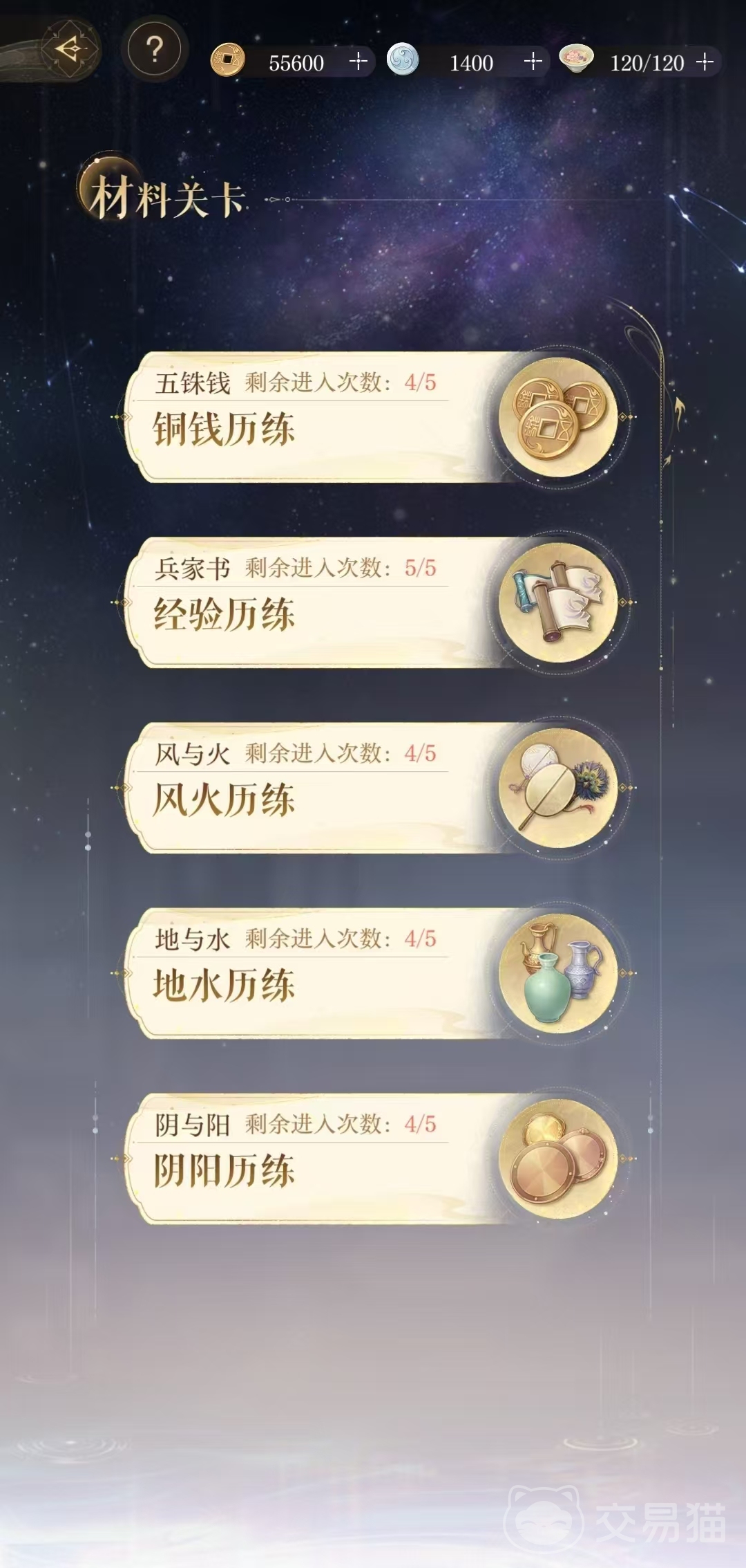 首先我们先了解一下如鸢历练玩法的相关介绍,在游戏中历练玩法总共分为5种类型的材料关卡。分别是铜钱历练、经验历练,风火历练、地水历练、阴阳历练等5种不同材料的历练关卡,这5种材料关卡是玩家获得铜钱、经验以及密探突破升级道具的关键副本。