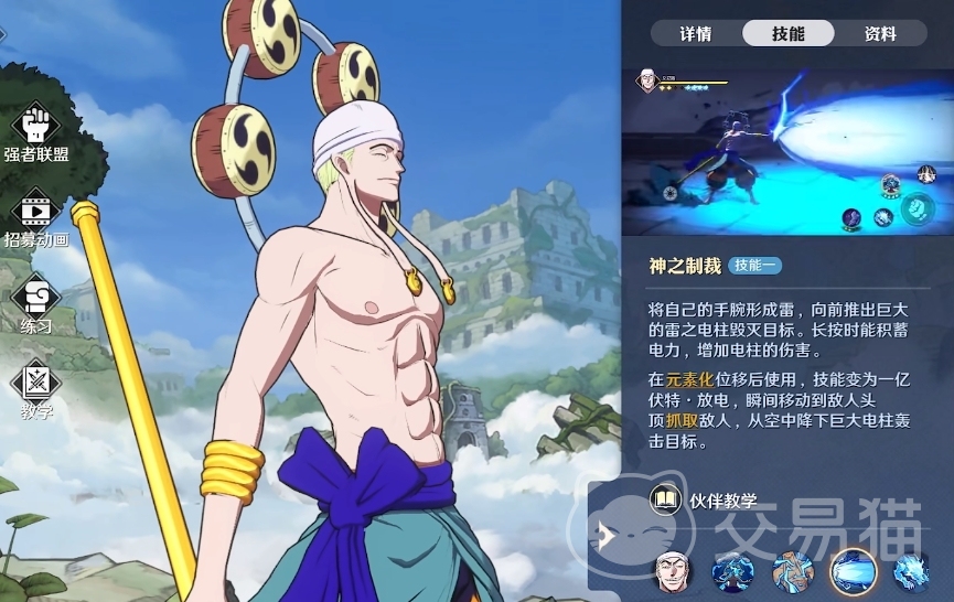 他的技能一:将自己的手腕形成雷,向前推出巨大的雷之电柱毁灭目标,在元素化状态下能够将雷电攻击变成一亿伏高电压且瞬移至敌人上方抓取敌人,造成高额雷电伤害;