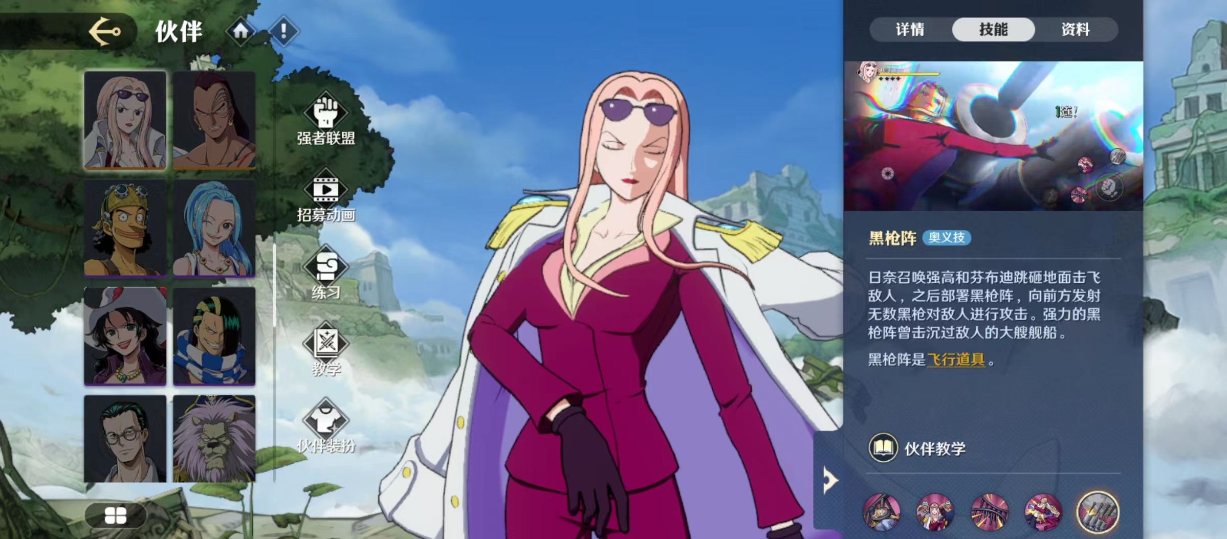 第2个主动技能是伸出手臂后向前突进一段距离,如果成功穿越敌人会补上一记攻击。奥义技能黑枪阵,召唤强高和芬布迪将敌人击飞,之后部署枪阵,向前方发射黑枪进行攻击。这一招的威力非常大,强力的黑枪阵曾经击沉过敌人的大型舰船,所以威力可想而知。