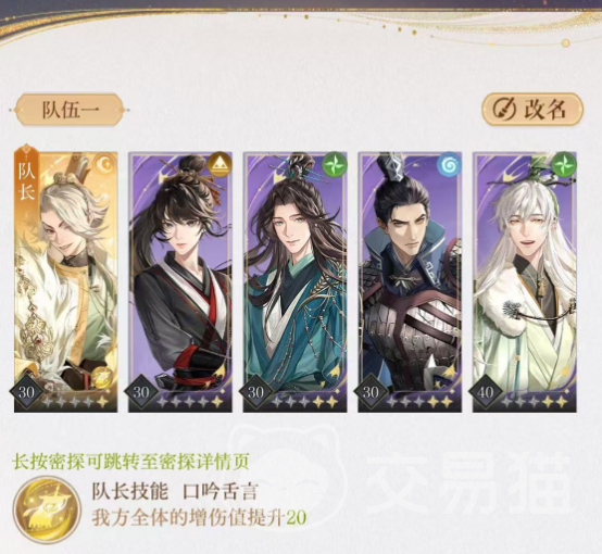 第1套为小伙伴们推荐的阵容搭配是鲁肃+阿蝉+陈登+文丑。这套阵容是初步的新手阵容,在机制和密探的技能配合上比较完整。本身杨修的技能概率就是看脸,而刚好这套阵容中的鲁肃触发的劝退效果,也是看一定的几率算是赌队的雏形。