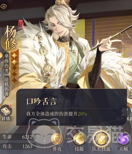 杨修带队的队伍整体队伍的伤害能够提高20%,即使杨修的输出不稳定但是玩家依旧可以培养到70级。杨修的职业是神纪,神纪在游戏中的定位是辅助杨修辅助的关键是在天赋。杨修的天赋在敌人被击败的时候会触发,能够让攻击提高该效果会叠加。