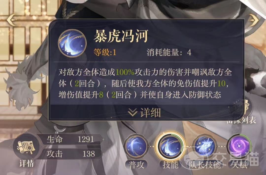 暴虎冯河大招技能作为群体技能,在造成群体攻击的基础上,可以为敌方阵容附加两回合的嘲讽状态,并且在提升全队免伤值与增伤值后,不消耗回合数直接进入防御状态,该技能直接具备群体攻击、群体辅助和单体防御效果,在紫色密探的大招技能中,不失为综合能力排名靠前的技能,值得殿下们在游戏前期进行培养。