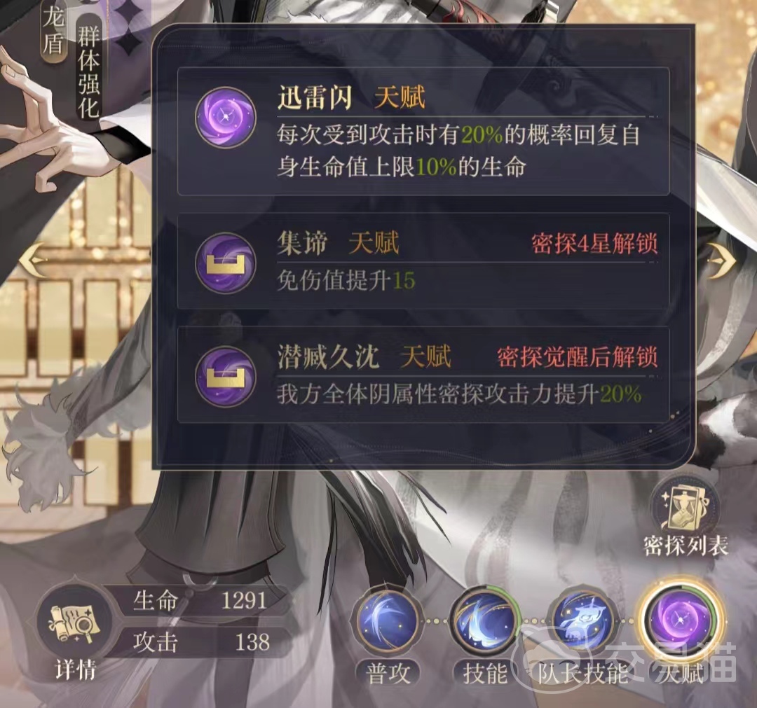 严白虎的天赋密探技能以辅助提升自身为主,而以辅助同属性的阴属性密探为辅,就严白虎的2星密探天赋讯雷闪而言,严白虎在概率上可以做到持续生命恢复的状态,增加自身在全队中存续的回合,增加编队战斗获胜的几率。而且,作为阴属性的密探,殿下们可以在自己拥有较少阴属性密探时考虑培养严白虎,在面临阳属性的敌方阵容时上阵严白虎密探。