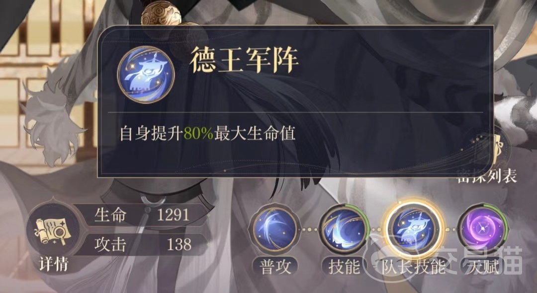 德王军阵作为严白虎的队长,其技能可以让处于队长位置的严白虎提升自身80%的生命值,这个技能不止可以让严白虎在生命值的角度缩小,与绝密密探的基础生命值差距,还可以作为队伍的打底密探,在面对敌人高额的群体伤害输出时,严白虎可以凭借这个队长技能最大限度保留生命,站到最后。