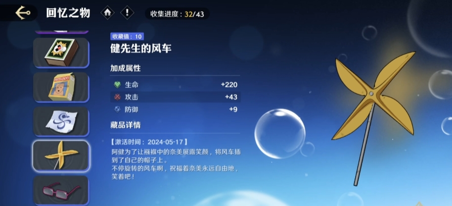 健先生的风车这个藏品收藏值10,增加生命值220,攻击值43,防御值9,无其他特殊加成。可见这个藏品对于玩家船只属性的加成一般,但是胜在好获得。