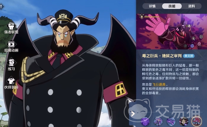 他的奥义技【地狱之审判】:从身体释放出骷髅妆毒雾,这个毒雾效果是鲜红色,一旦被沾染上会造成持续性中毒效果,这个技能释放是伴随飞行道具使出;
