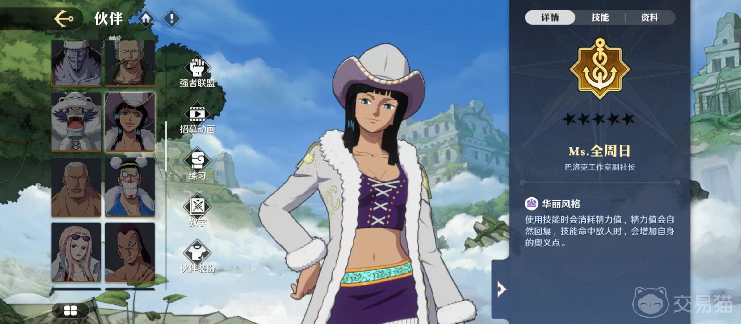 当大家进入游戏后,在伙伴列表中找到全周日,这就是大家所熟悉的罗宾,他是巴洛克工作室副社长。自身属于华丽风格的角色使用技能会消耗精力值,然后自动恢复精力值,命中敌人后会增加奥义点。作为花朵之果的能力者,身体任何部位都能像花一样绽放。被动技能是花花之,每相邻两次攻击连续触发精力回复时,回复效果提升100%,并出现蓝色提示特效。普攻5段命中敌人时,能恢复10点,触发被动时回复20点。