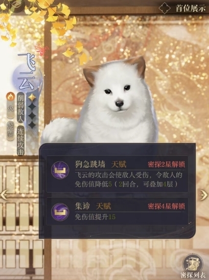 若是各位打算去培养它的话,两个天赋也是不容错过的,其中密探2星解锁的狗急跳墙能够让飞云的攻击使目标敌人受伤,令敌人的免伤值降低5,效果持续(2回合,最多可叠加至4层,而密探4星解锁的集谛也是非常不错的,免伤值提升15,大大增强自身的繁防御能力。