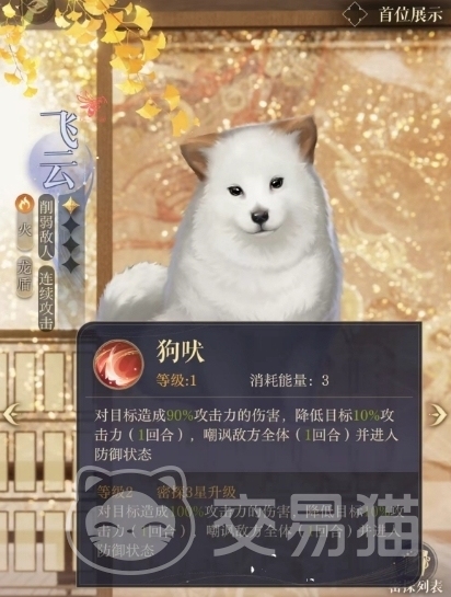 而技能狗吠的效果为,针对目标带来90%的攻击力伤害,还会降低目标10%的攻击力,效果会持续一个回合,小编觉得这个技能比较好用的是嘲讽敌方全体,效果持续一个回合,等于是为队伍带来了一个喘息的机会,如果敌人实力强大的话,它的这个技能往往是能帮助队伍找到扭转战局之机的,自身也是会进入防御状态,大大保障了续航。