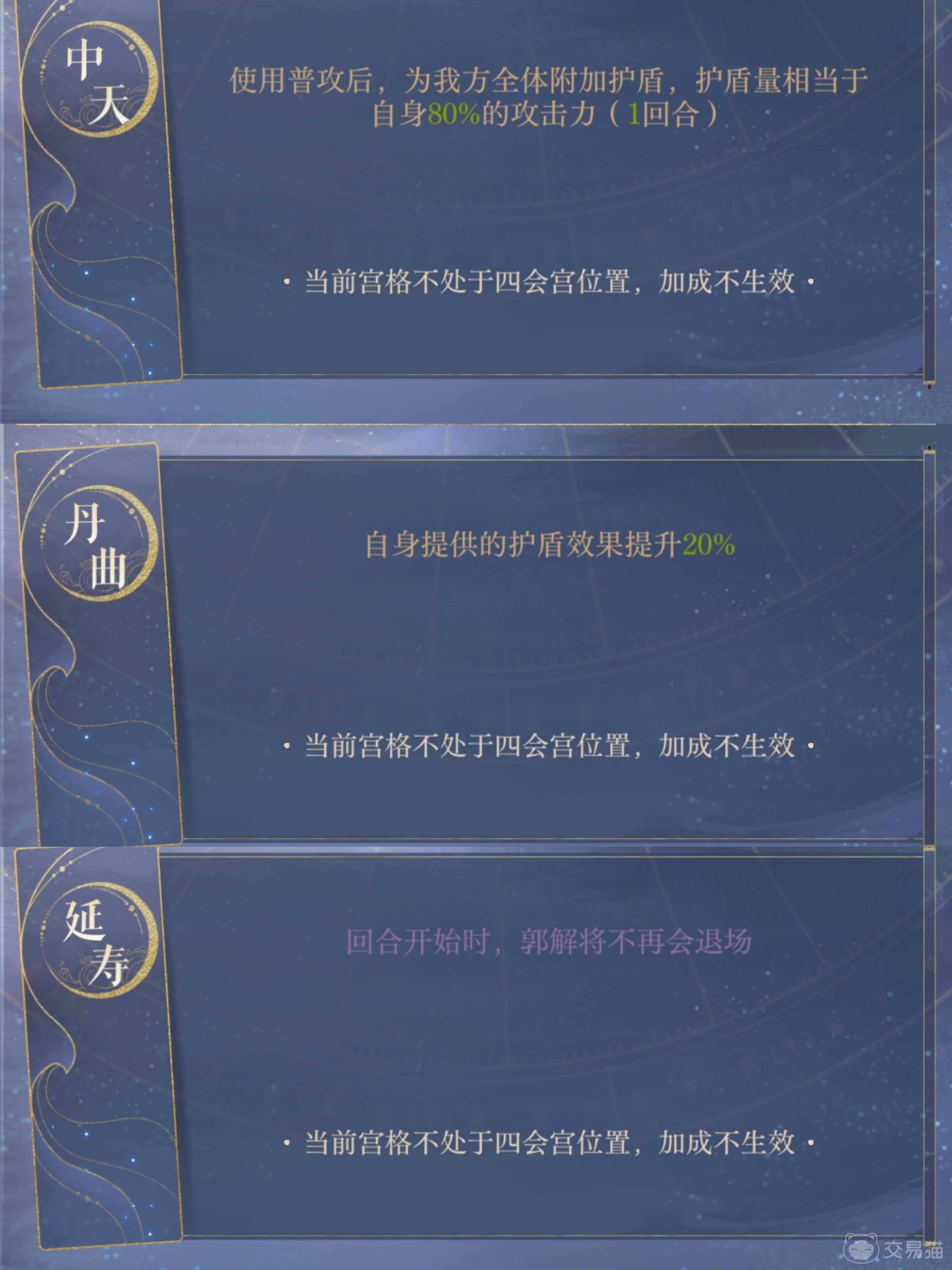 郭解目前的命盘比较推荐大家发展的线路是带普攻加护盾+变阵+不退场,等大家到达30级之后就可以刷命盘了,队长技能可以带来40%的最大生命,普攻可以带来80%的攻击力,大招则是18%的生命数值,都是能够给队友套盾的。