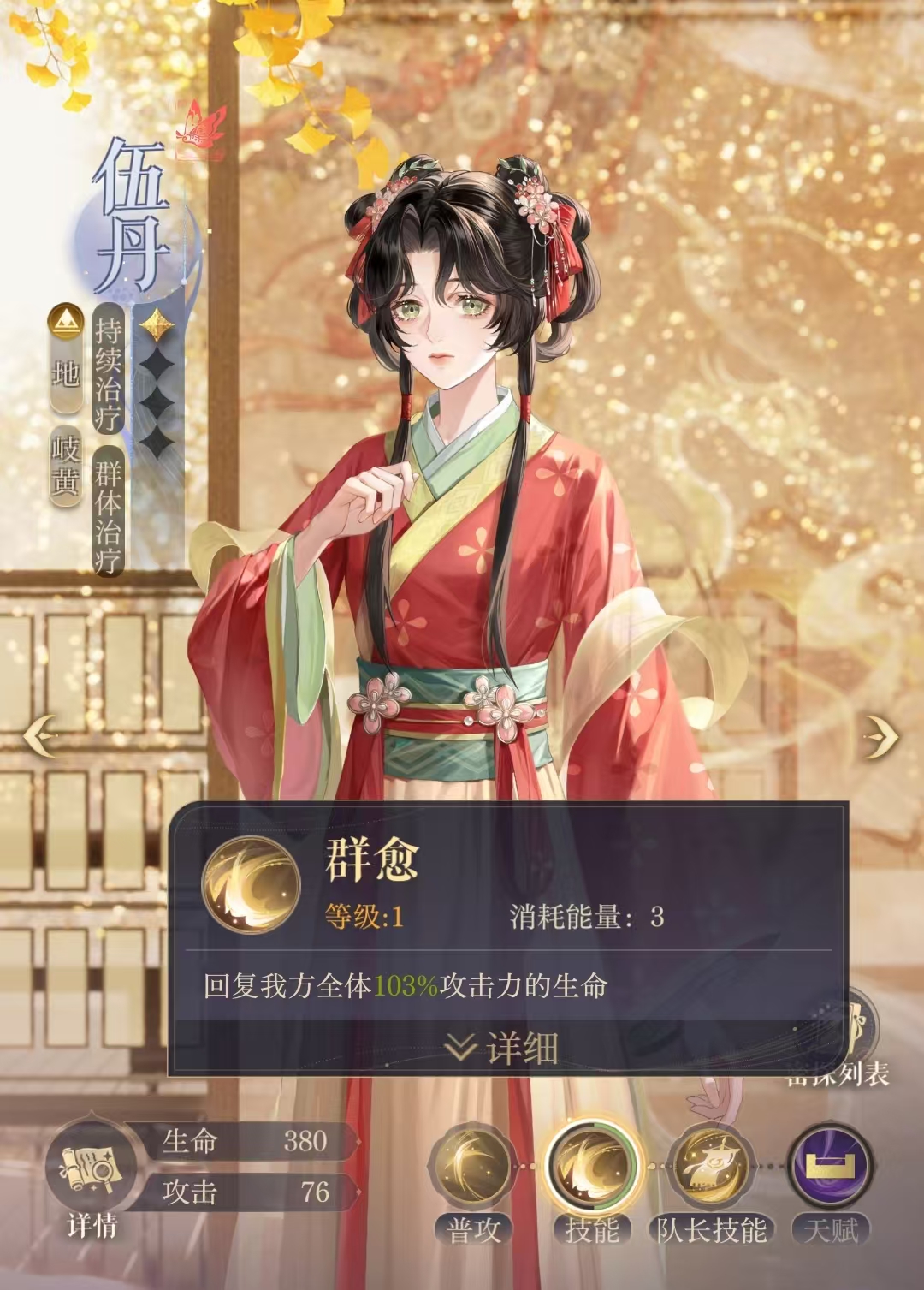 因为伍丹本身就是一个回血量的角色。自身提供效果治疗提升,能够更好地让普攻治疗和技能治疗的治疗效果,达到一定的数值。其次的是推荐玩家初始能量加二的这个关键性词条,因为在游戏中进行战斗的时候。伍丹技能损耗量是3个点.初始能量加二能够保证伍丹前几个回合都能一直开大。