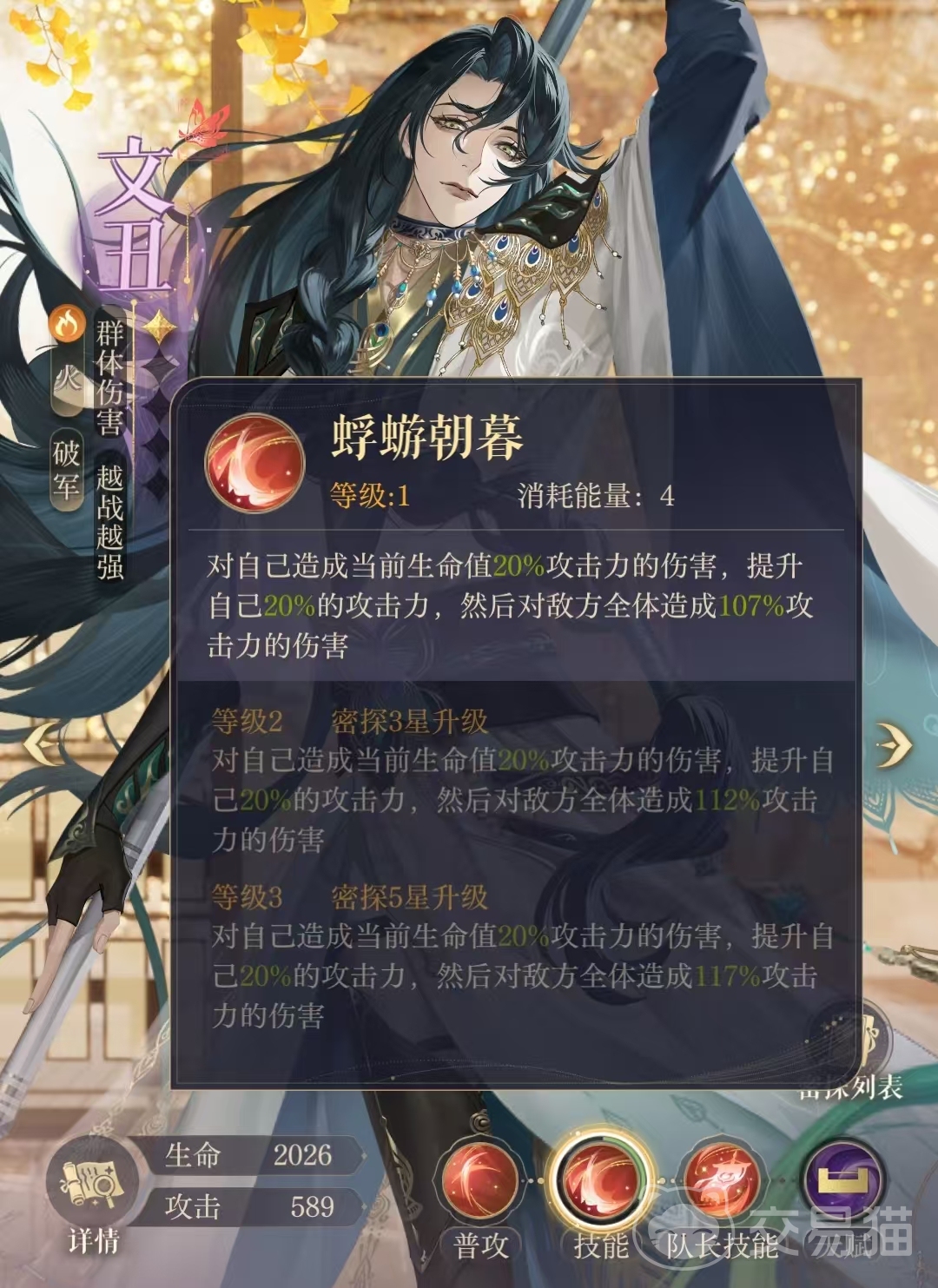 文丑的技能是有点变态的,因为文丑的技能是对自己伤害20%的伤害俩提高自己的攻击力。在文丑的攻击力提高了之后再对敌人进行107%的攻击伤害,总而言之文丑的输出技能就是以伤换伤不要命的打法。
