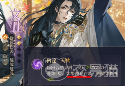 文丑在玩家游戏的前期没有输出的时候,能够充当玩家的主c进行输出。虽然文丑作为输出在后期会略微不足,但是他和我们的盾爹颜良在同一队伍的时候,能促成牵绊效果。两者相结合在一起文丑的攻击效果会更快,输出会更加猛烈。