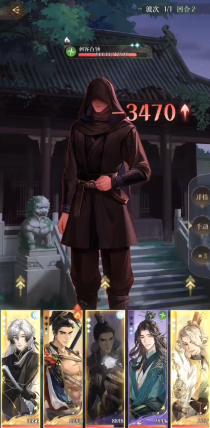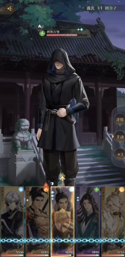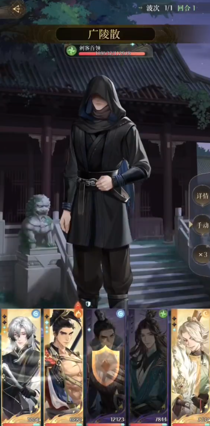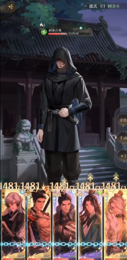 首先第1回合,陈登率先放大招给吕蒙充能变身,然后需要保血量的密探,比如在整体队伍中血量最低的王粲就要下拉防御,准备吃刺客首领的普通攻击。