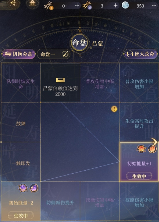 此外,另一种无王粲的打法,如果玩家在新限定卡池中抽到孙权的话,可以在阵容中替换王粲位置。先给孙权洗防御嘲讽和回血的命盘,然后叠紫色或橙色生命星石,在战斗中孙权和颜良轮流在普攻回合嘲讽,其他密探输出,不过对队伍修为攻击力要求较高。