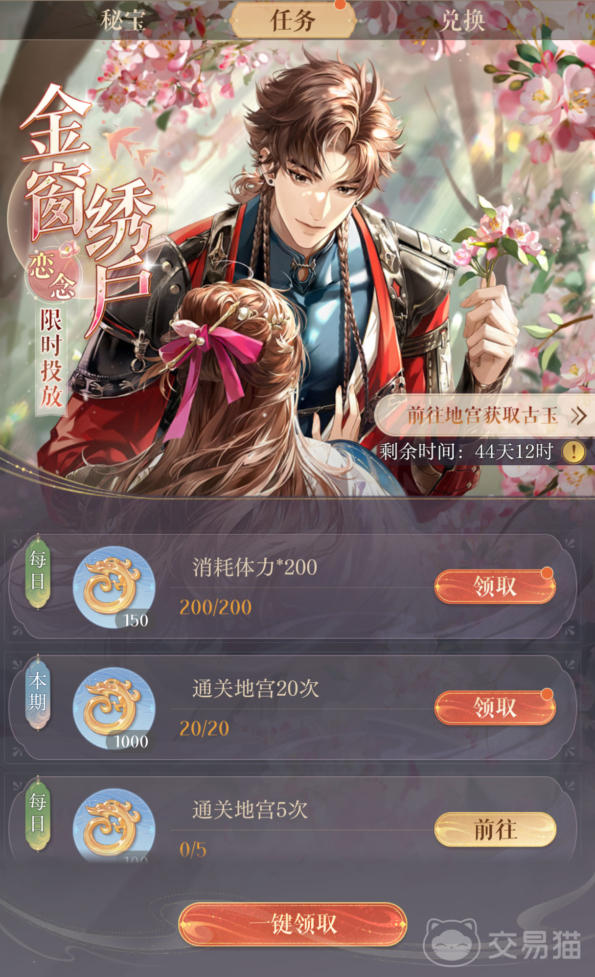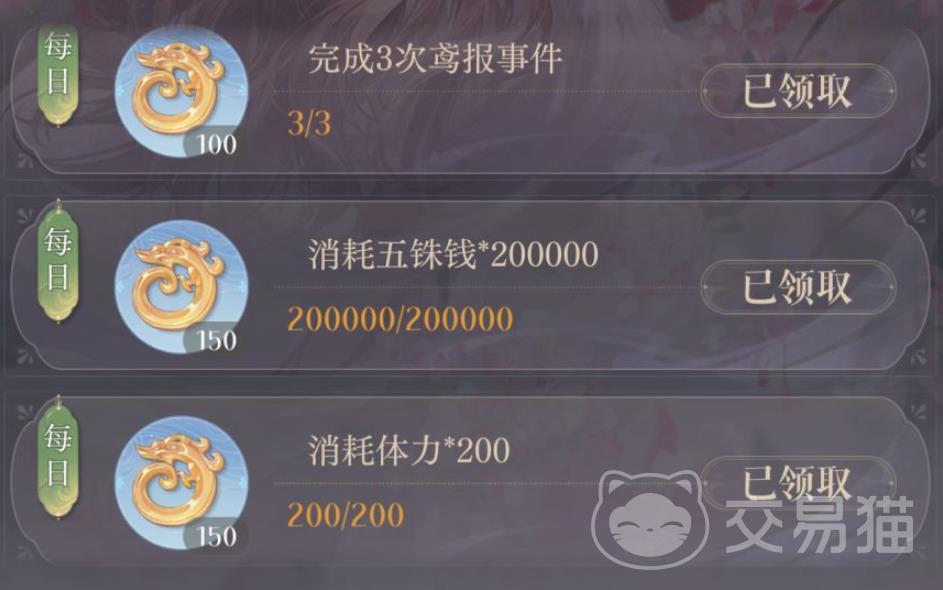 每日的任务事件有:雀部解密两次、消耗三个行囊、通关地宫5次、完成三次鸢报事件、消耗五铢钱20万、消耗200点体力值,以上分别可以获取100~150个古玉,都是每日轻松可做,必须完成的任务。