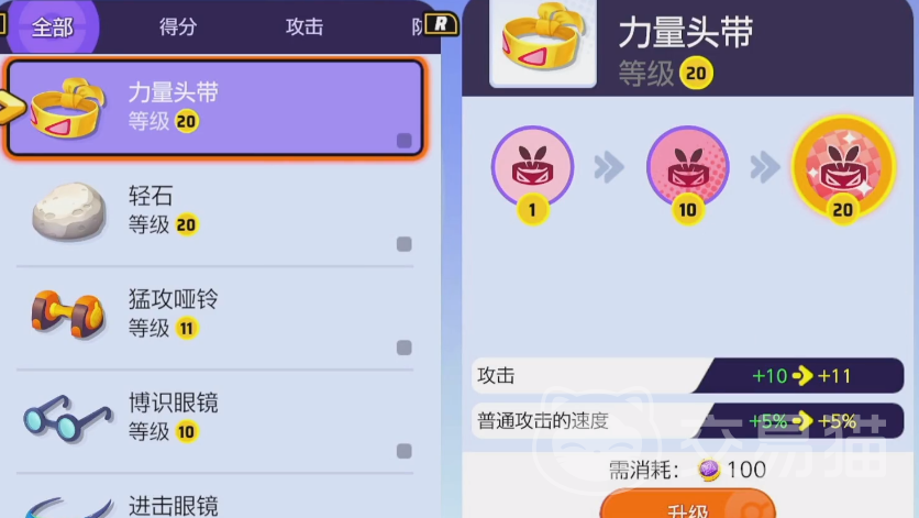 在游戏里每一个宝可梦的类型是不一样的,需要根据这些宝可梦的特性选择不同的道具,只有这样才能更好的发挥这些精灵的战斗能力,在众多道具里,最先推荐玩家升级的就是力量头带,这本身是一个能增加物理攻击和速度的道具,可以尝试把力量头带升到满级,这样还能产生大额的伤害。