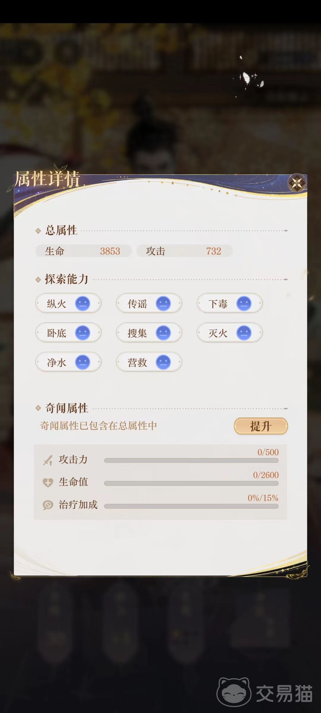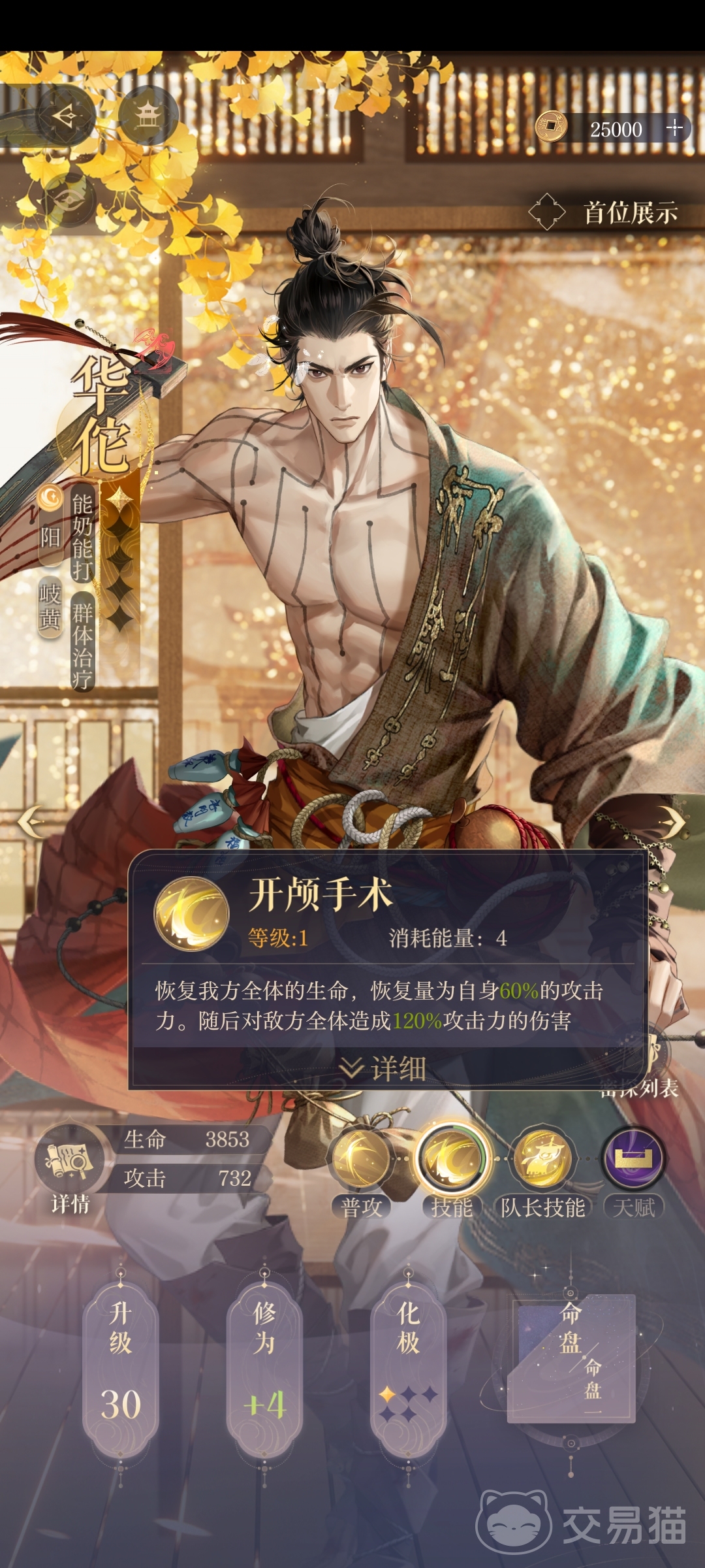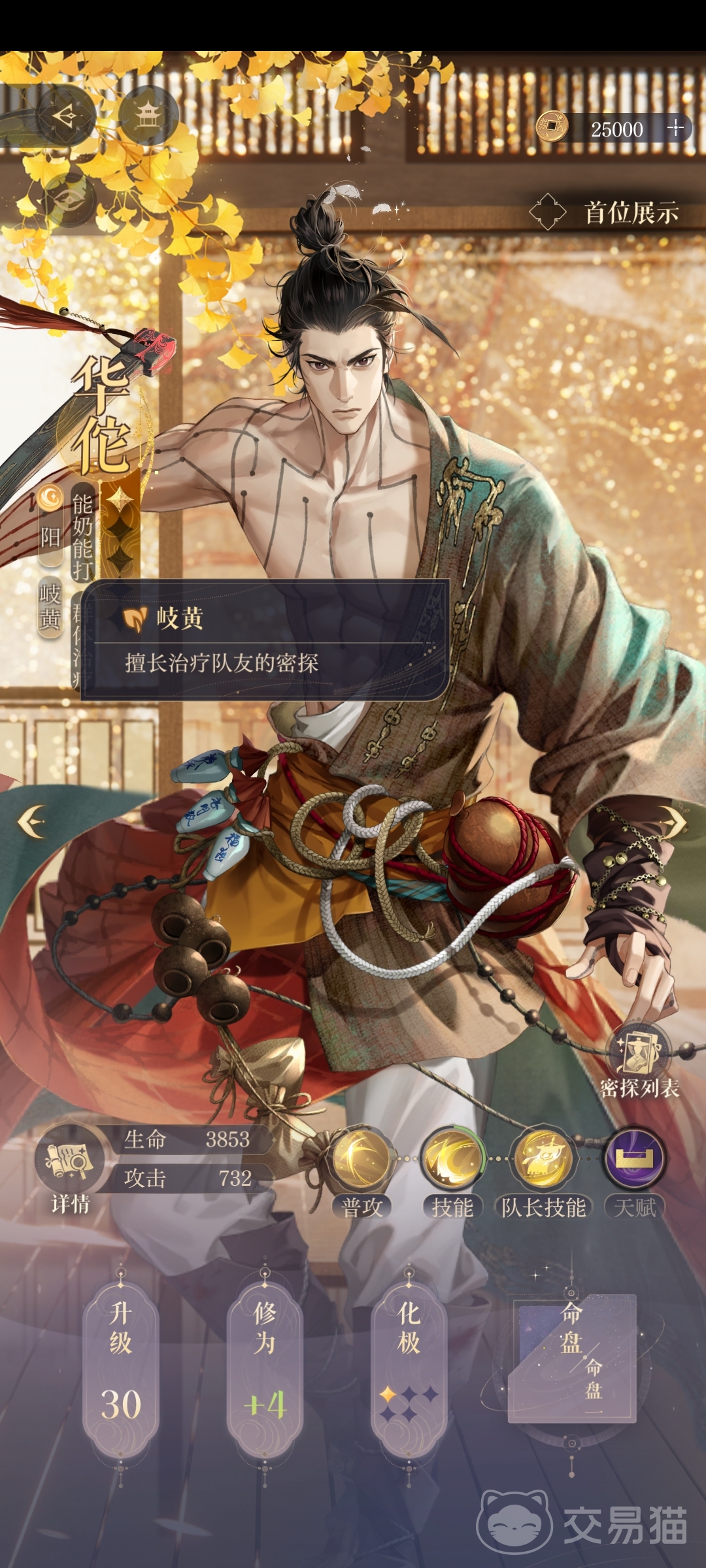 密探华佗自身是属于阳属性的可以为队友治疗的密探,他在技能上的话是属于可以为己方队员附加群体治疗效果,而且还拥有着不错的攻击输出,可以说是能奶能打。所以在提升华佗的漆园蝶相关的数值的时候。殿下们可以着重考虑往提升华佗自身的生命和治疗效果方向发展。