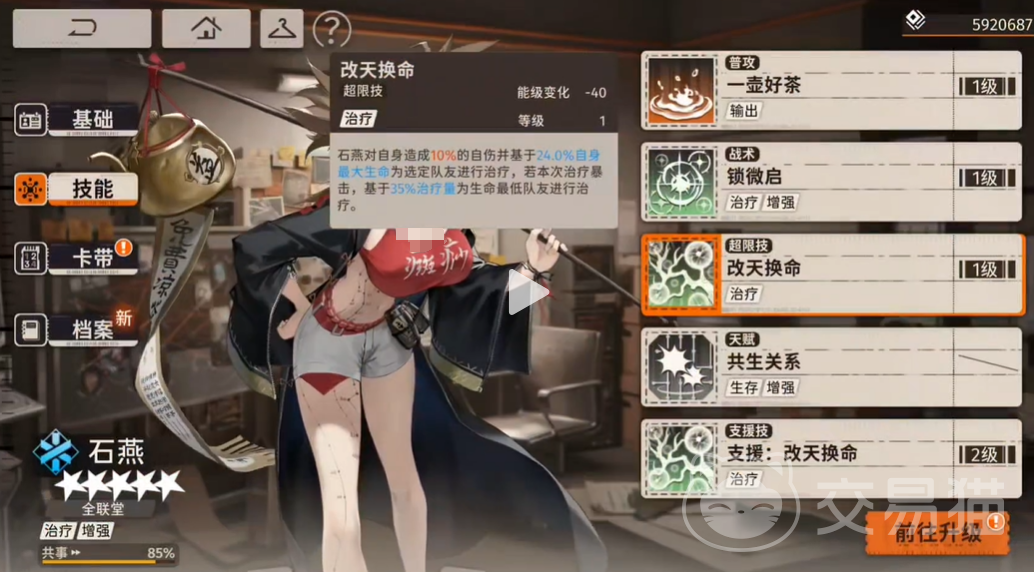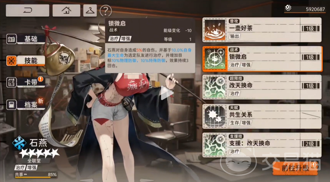 石燕的普攻“一壶好茶”不只是一个普通的攻击,它会对敌人造成较高百分比的特殊伤害(达到142.93%)。在输出上,这个技能虽然看似平平无奇,但其带来的能级变化+8,能够为后续释放其他高能耗技能提供充足的能量支持。因此,玩家在使用石燕时,可以通过多次使用普攻迅速积累能量,为后续的战术或超限技提供更好的发挥空间。培养中,提升普攻的等级可以在一定程度上增强石燕的整体输出能力。