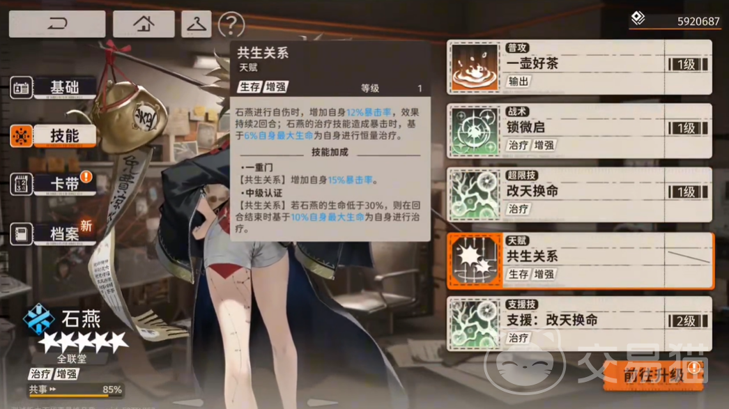 石燕的天赋“共生关系”与她的自伤机制密切相关。每当石燕使用技能对自己造成伤害时,她的暴击率会在接下来的两个回合内提高20%,这让她的治疗技能更容易将暴击效果触发。同时,当治疗技能有暴击时,石燕还会根据自身最大生命值为自己进行额外治疗。这使得石燕不仅能够在辅助队友的同时保护自己,还大大增加了她在长时间战斗中的生存能力。因此,在提升天赋的同时,建议玩家注重石燕的暴击属性,以确保她的技能暴击率能够达到最大化。
