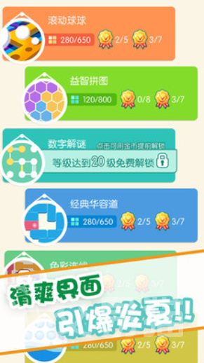 不仅如此,在这款游戏中除了滚动球球玩法之外,还为小伙伴们提供了一些其他的益智游戏,比如说拼图和数字解谜等,在这款游戏中,小伙伴们可以选择多种玩法模式,每一款都轻松有趣,并且有着极大的挑战性。