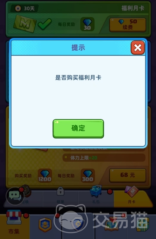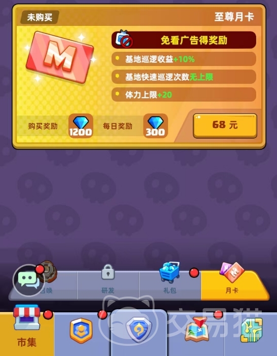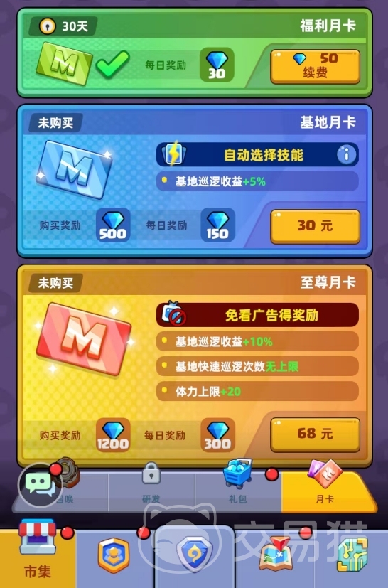 该作中的月卡共有三种,其中福利月卡是能用50钻石直接购买的,买入后30天内每天可拿到30钻石的奖励,共计900钻石,是性价比最高的月卡。而基地月卡则属于第二档的月卡,买入后能直接拿到500钻石的奖励,每日更是能收获150钻,还能直接开启自动放技能和巡逻收益增加5%的功能。