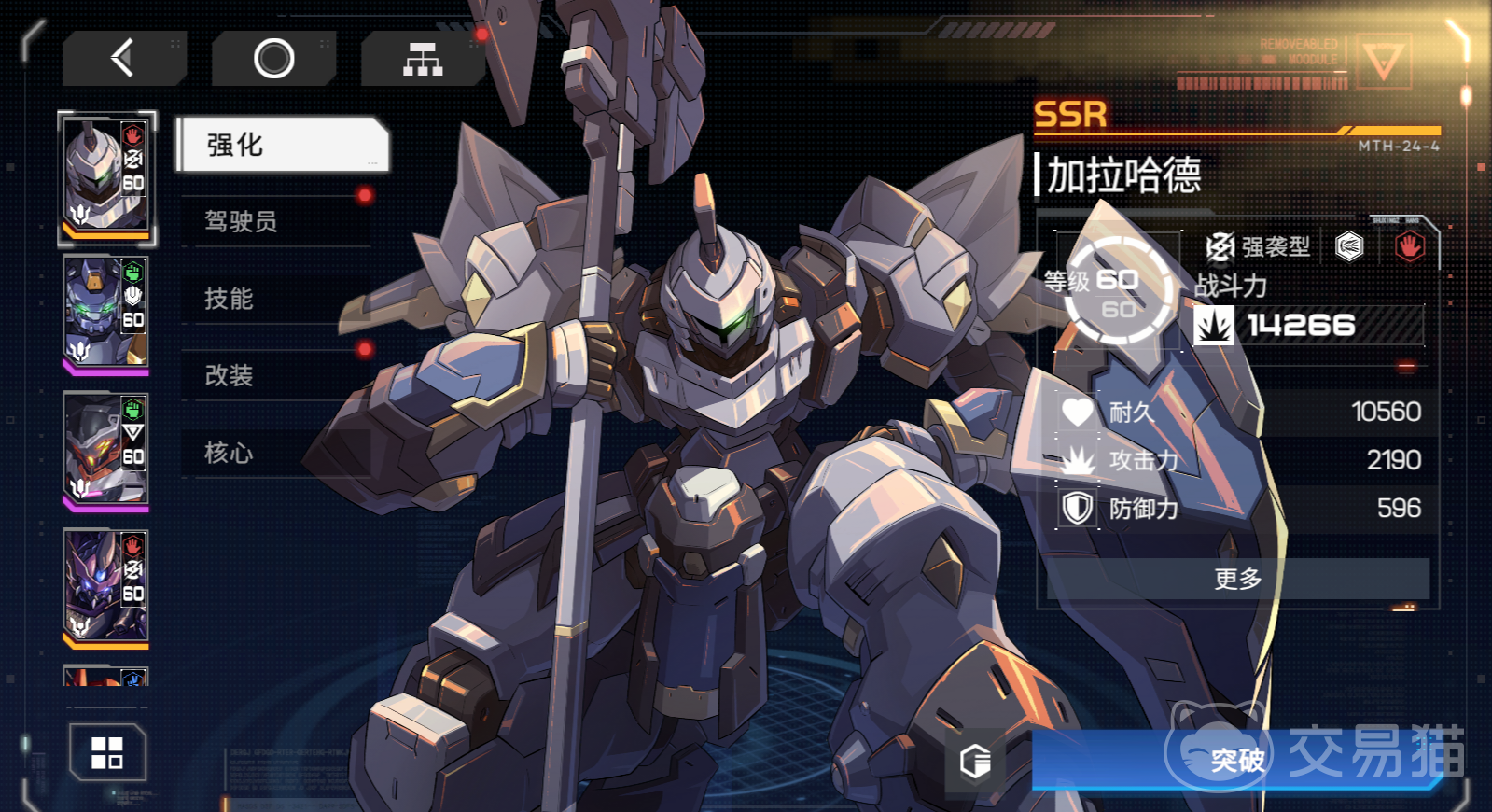 加哈拉德是一种强袭类型的机甲,该机甲的品阶为ssr,机甲最擅长对内部结构进行破坏,每一次攻击都会给对手造成大范围的伤害同时还会使敌方机甲出现过载情况。
