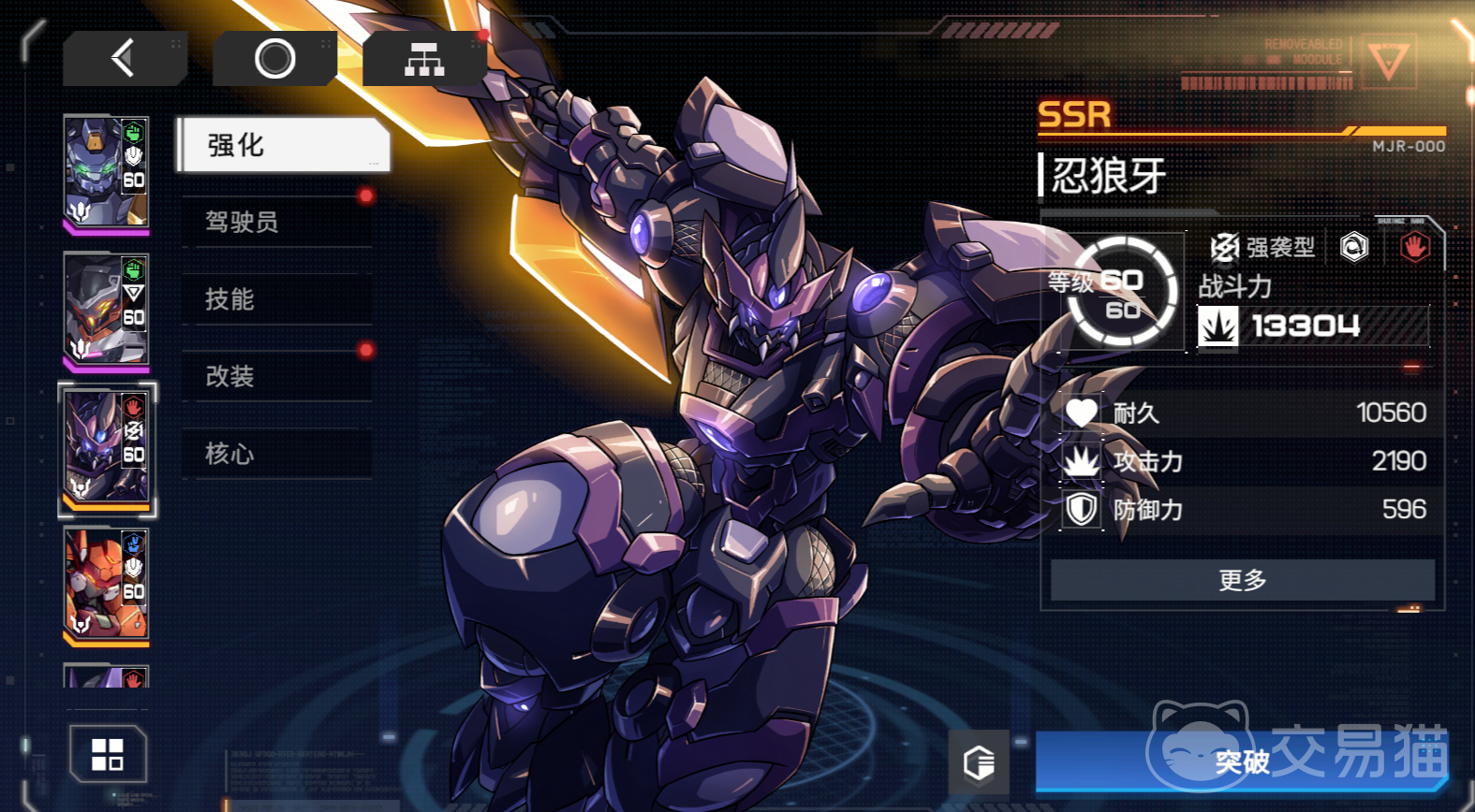 忍狼牙和加哈拉德一样都是强袭类型的机甲,和加哈拉德不一样的是,忍狼牙的特点更擅长借机攻击,在硬核机甲启示中,忍狼牙是一款本身表现非常出色的机甲,虽然它的基础技能在格斗机中并不是特别的出色,但是它的火力攻击确是其他机甲都比不上的。