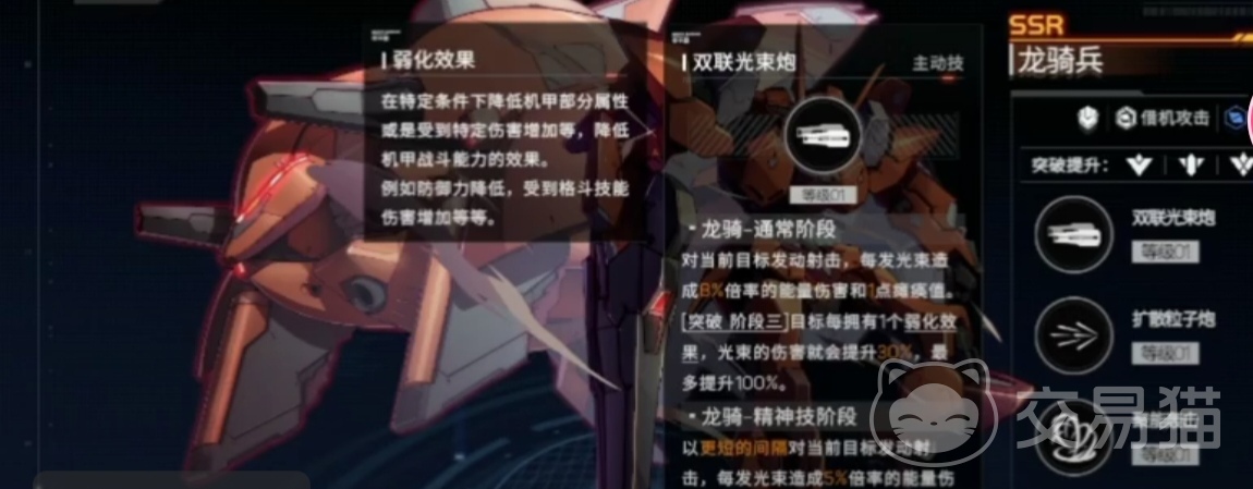 龙骑兵是一种重装类型的机甲,ssr品阶的它最擅长借机攻击,也就是当敌方机甲已经陷入到瘫痪的时候可以给对方造成大量的伤害,敌方机甲的瘫痪时间也会被延长。