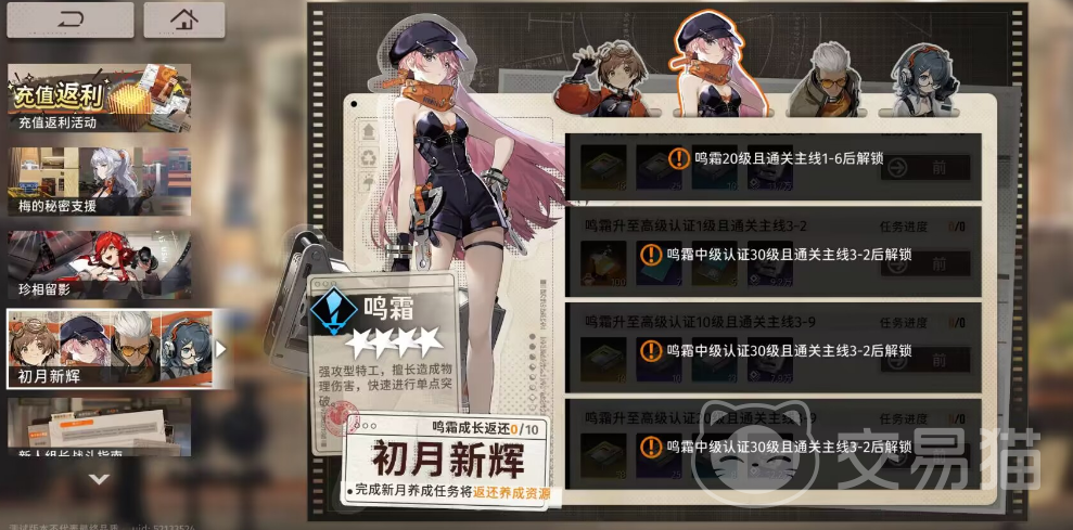 当你完成了序章的基本引导后,可谓真正进入了新月同行的核心环节。开局的四名角色——星凉(奶妈)、鸣霜(单体物理输出+debuff增伤)、千秋(群体特攻)和忠元(盾哥)被玩家们亲切地称为“御四家”。这些角色不仅在前期就可以使用,还能一直培养到二阶20级,而且养成返还机制让你无需担心资源浪费。