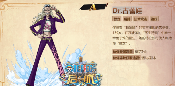 在《航海王壮志雄心》这款以《海贼王》为背景的手游中,DR.古蕾娃以其独特的角色定位和技能组合,成为了众多玩家队伍中不可或缺的一员。“航海王壮志雄心dr古雷娃怎么样”?作为一位后排智力型辅助伙伴,DR.古蕾娃不仅拥有强大的治疗能力,还兼具单体控制和群体辅助,是战斗中的多面手。